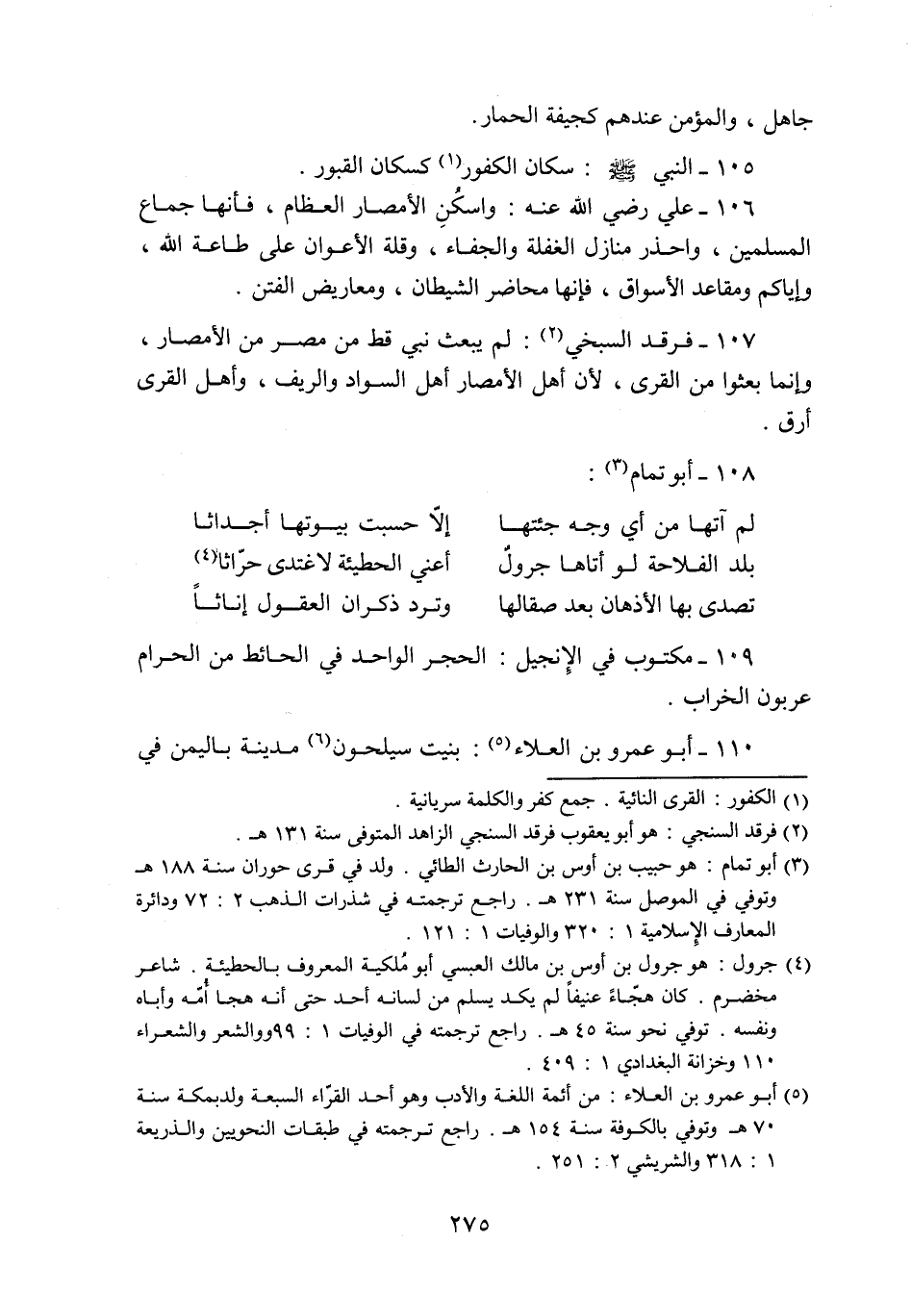 107- فرقد السبخي «2» : لم يبعث نبي قط من مصر من الأمصار، وإنما بعثوا من القرى، لأن أهل الأمصار أهل السواد والريف، وأهل القرى أرق.