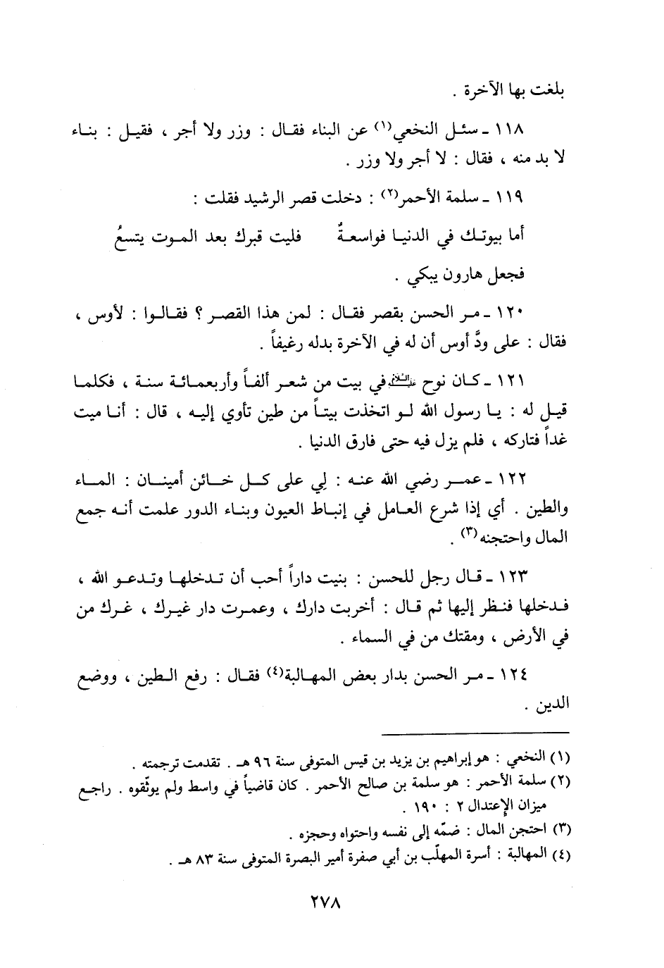 118- سئل النخعي «1» عن البناء فقال: وزر ولا أجر، فقيل: بناء لا بد منه، فقال: لا أجر ولا وزر.