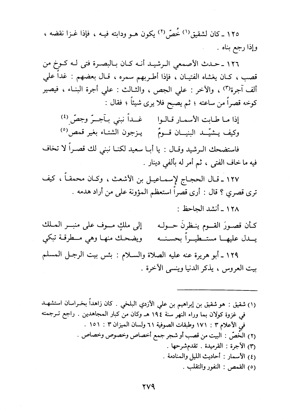 125- كان لشقيق «1» خصّ «2» يكون هو ودابته فيه، فإذا غزا نقضه، وإذا رجع بناه.