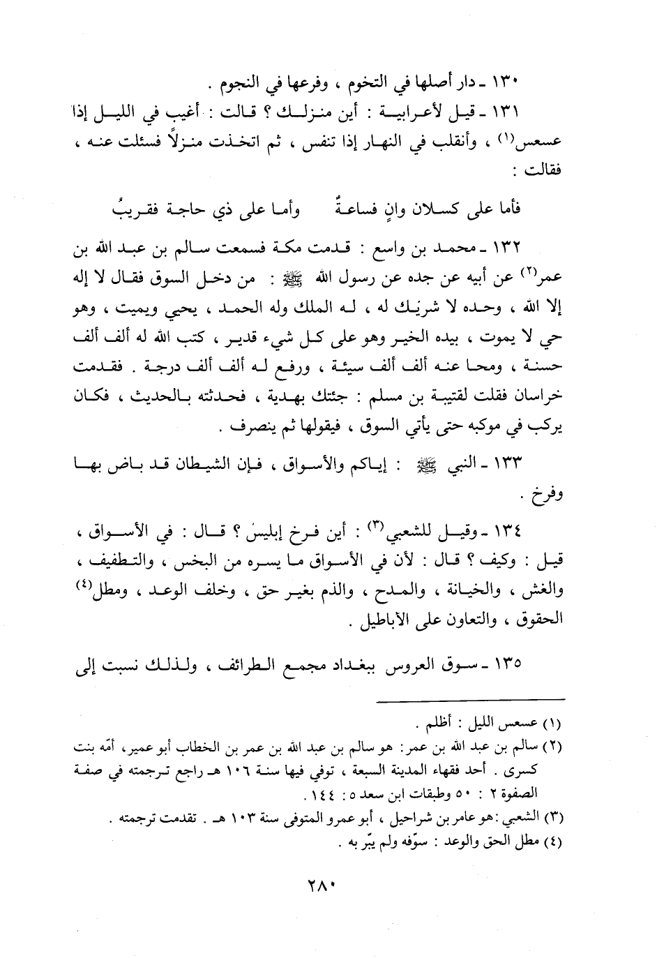 134- وقيل للشعبي «3» : أين فرخ إبليس؟ قال: في الأسواق، قيل: وكيف؟ قال: لأن في الأسواق ما يسره من البخس، والتطفيف، والغش، والخيانة، والمدح، والذم بغير حق، وخلف الوعد، ومطل «4» الحقوق، والتعاون على الأباطيل.