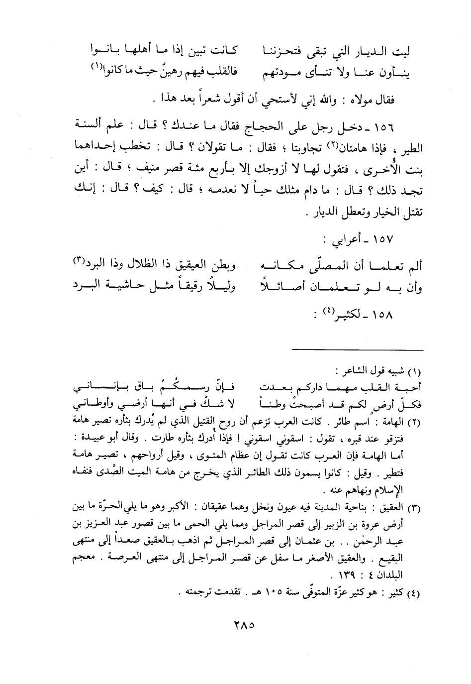 156- دخل رجل على الحجاج فقال ما عندك؟ قال: علم ألسنة الطير، فإذا هامتان «2» تجاوبتا؛ فقال: ما تقولان؟ قال: تخطب إحداهما بنت الأخرى، فتقول لها لا أزوجك إلا بأربع مئة قصر منيف؛ قال: أين تجد ذلك؟ قال: ما دام مثلك حيا لا نعدمه؛ قال: كيف؟ قال: إنك تقتل الخيار وتعطل الديار.