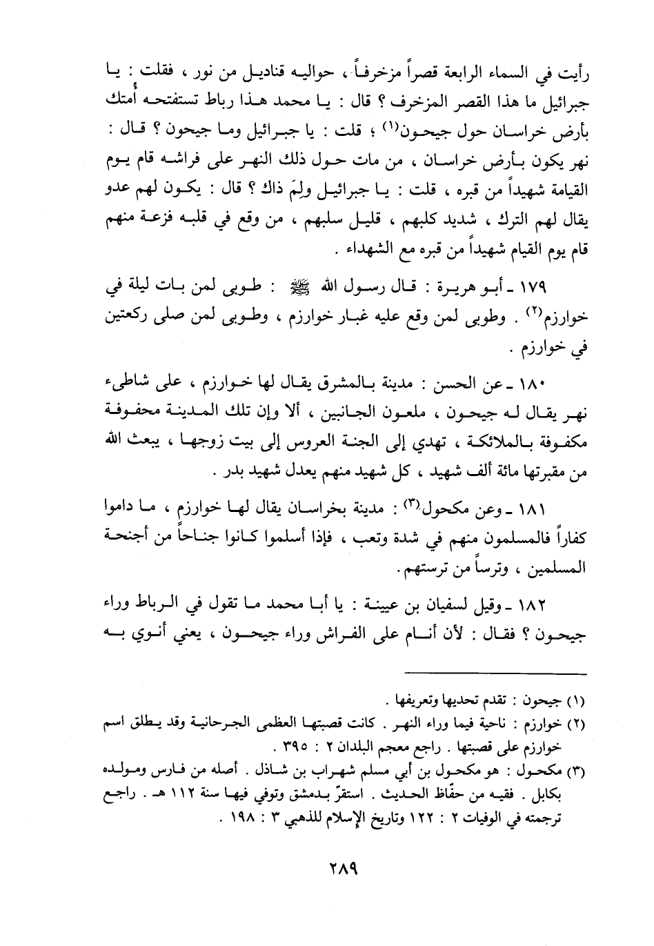 179- أبو هريرة: قال رسول الله صلّى الله عليه وسلّم: طوبى لمن بات ليلة في خوارزم «2» . وطوبى لمن وقع عليه غبار خوارزم، وطوبى لمن صلى ركعتين في خوارزم.