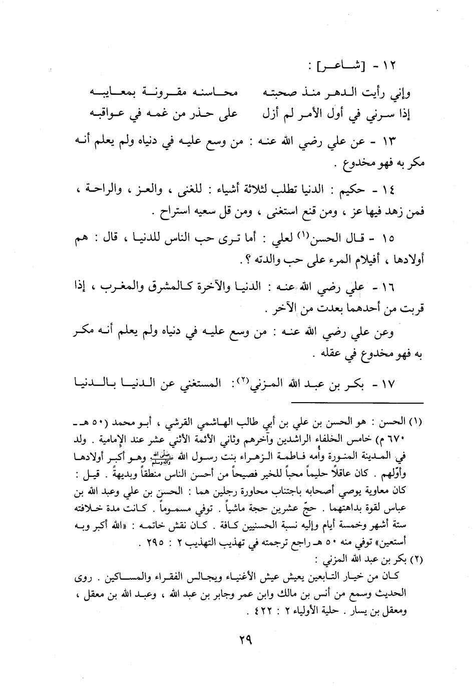 14- حكيم: الدنيا تطلب لثلاثة أشياء: للغنى، والعز، والراحة، فمن زهد فيها عز، ومن قنع استغنى، ومن قل سعيه استراح.