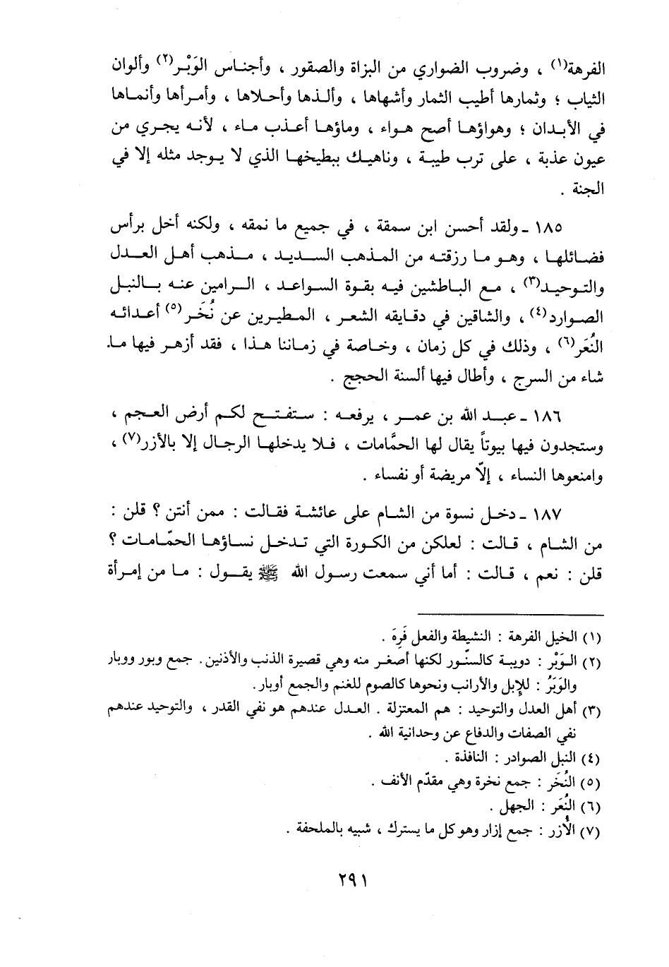 186- عبد الله بن عمر، يرفعه: ستفتح لكم أرض العجم، وستجدون فيها بيوتا يقال لها الحمّامات، فلا يدخلها الرجال إلا بالأزر «7» ، وامنعوها النساء، إلّا مريضة أو نفساء.