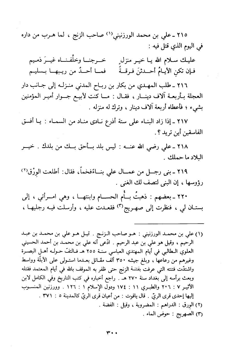 216- طلب المهدي من بكار بن رباح المدني منزله إلى جانب دار العجلة بأربعة آلاف دينار، فقال: ما كنت لأبيع جوار أمير المؤمنين بشيء؛ فأعطاه أربعة آلاف دينار، وترك له منزله.