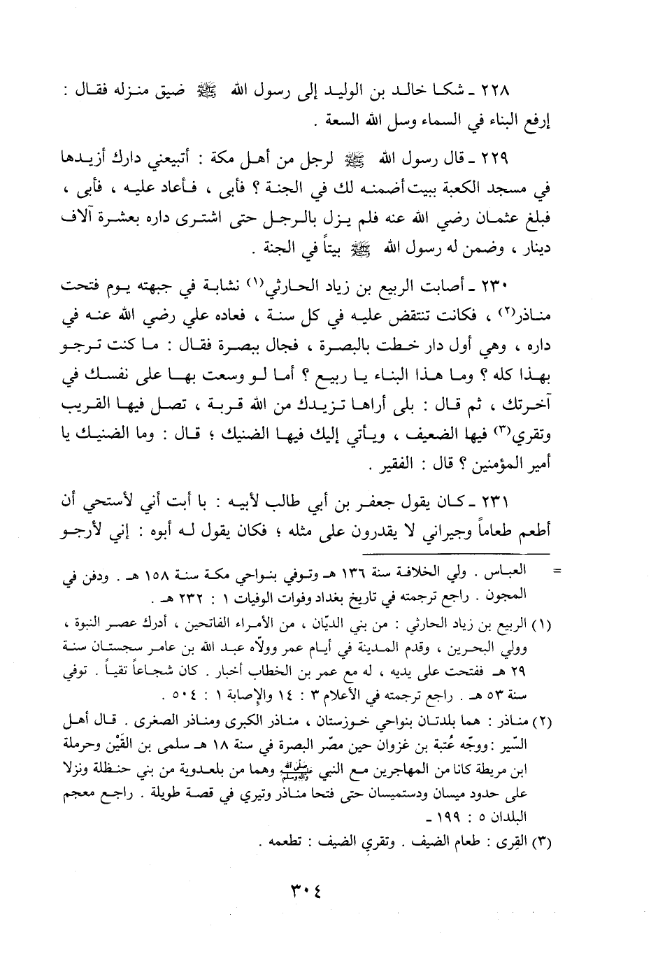 229- قال رسول الله صلّى الله عليه وسلّم لرجل من أهل مكة: أتبيعني دارك أزيدها في مسجد الكعبة ببيت أضمنه لك في الجنة؟ فأبى، فأعاد عليه، فأبى، فبلغ عثمان رضي الله عنه فلم يزل بالرجل حتى اشترى داره بعشرة آلاف دينار، وضمن له رسول الله صلّى الله عليه وسلّم بيتا في الجنة.