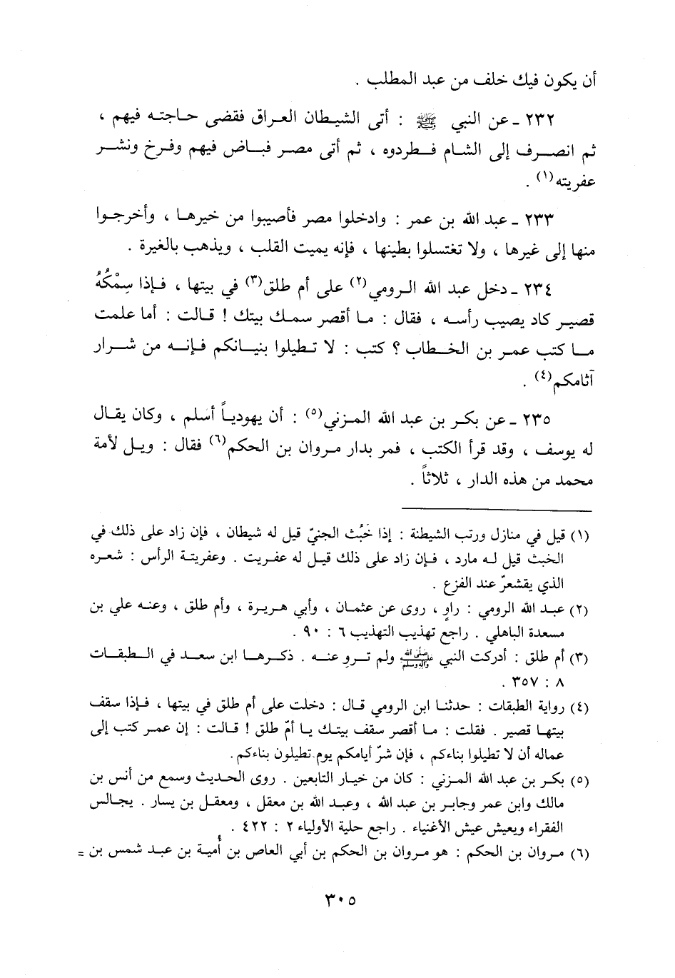 235- عن بكر بن عبد الله المزني «5» : أن يهوديا أسلم، وكان يقال له يوسف، وقد قرأ الكتب، فمر بدار مروان بن الحكم «6» فقال: ويل لأمة محمد من هذه الدار، ثلاثا.