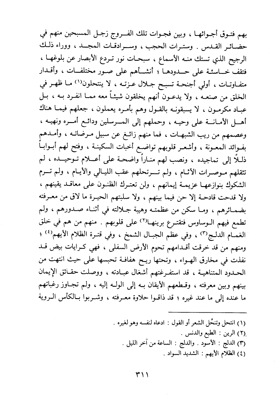 بهم فتوق أجوائها، وبين فجوات تلك الفروج زجل المسبحين منهم في حضائر القدس. وسترات الحجب، وسرادقات المجد، ووراء ذلك الرجيح الذي تستك منه الأسماع، سبحات نور تردع الأبصار عن بلوغها، فتقف خاسئة على حدودها؛ أنشأهم على صور مختلفات، وأقدار متفاوتات، أولي أجنحة تسبح جلال عزته، لا ينتحلون «1» ما ظهر في الخلق من صنعه، ولا يدعون أنهم يخلقون شيئا معه مما انفرد به، بل عباد مكرمون، لا يسبقونه بالقول وهم بأمره يعملون، جعلهم فيما هناك أهل الأمانة على وحيه، وحملهم إلى المرسلين ودائع أمره ونهيه، وعصمهم من ريب الشبهات، فما منهم زائغ عن سبيل مرضاته، وأمدهم بفوائد المعونة، وأشعر قلوبهم تواضع أخبات السكينة، وفتح لهم أبوابا ذللا إلى تماجيده، ونصب لهم منارا واضحة على أعلام توحيده، لم تثقلهم موصرات الآثام، ولم ترتحلهم عقب الليالي والأيام، ولم ترم الشكوك بنوازعها عزيمة إيمانهم، ولن تعترك الظنون على معاقد يقينهم، ولا قدحت قادحة إلا حن فيما بينهم، ولا سلبتهم الحيرة ما لاق من معرفته بضمائرهم، وما سكن من عظمته وهيبة جلالته في أثناء صدورهم، ولم تطمع فيهم الوساوس فتقترع برينها «2» على قلوبهم. منهم من هم في خلق الغمام الدلج «3» ، وفي عظم الجبال الشمخ، وفي قترة الظلام الأيهم «4» ؛ ومنهم من قد خرقت أقدامهم تحوم الأرض السفلى، فهي كرايات بيض قد نفذت في مخارق الهواء، وتحتها ريح هفافة تحبسها على حيث انتهت من الحدود المتناهية، قد استفرغتهم أشغال عبادته، ووصلت حقائق الإيمان بينهم وبين معرفته، وقطعهم الأيقان به إلى الوله إليه، ولم تجاوز رغباتهم ما عنده إلى ما عند غيره؛ قد ذاقوا حلاوة معرفته، وشربوا بالكأس الروية