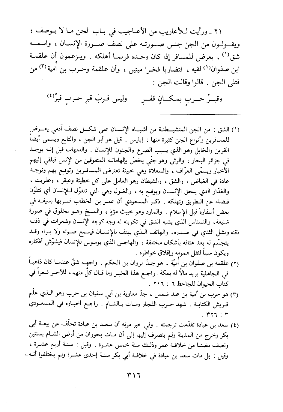 21- ورأيت للأعاريب من الأعاجيب في باب الجن ما لا يوصف؛ ويقولون من الجن جنس صورته على نصف صورة الإنسان، واسمه شق «1» ، يعرض للمسافر إذا كان وحده فربما أهلكه. ويزعمون أن علقمة ابن صفوان «2» لقيه، فتضاربا فخرا ميتين، وأن علقمة وحرب بن أمية «3» من قتلى الجن. قالوا وقالت الجن: