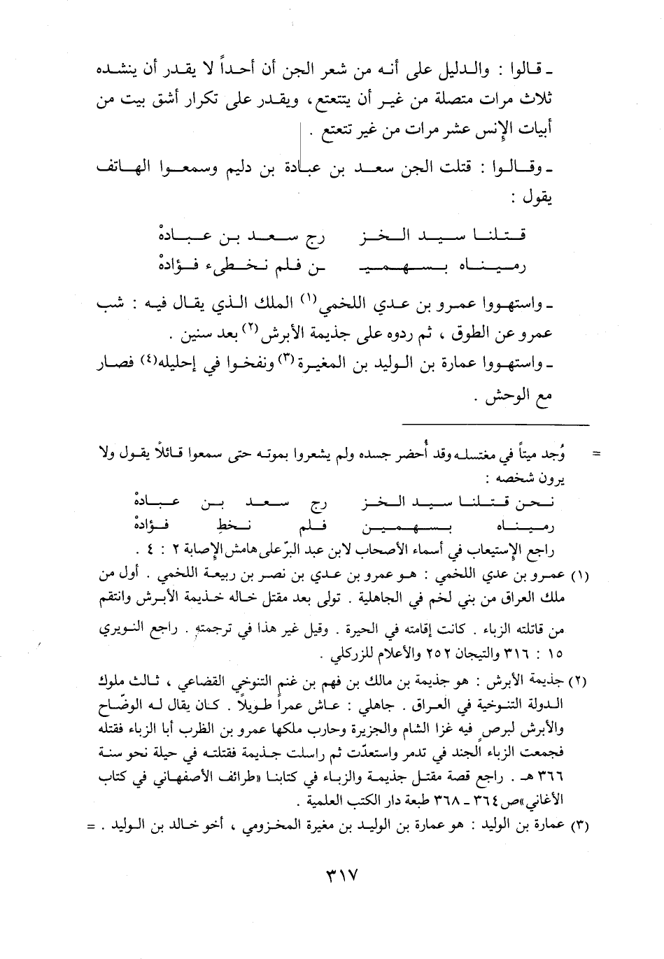 - وقالوا: قتلت الجن سعد بن عبادة بن دليم وسمعوا الهاتف يقول: