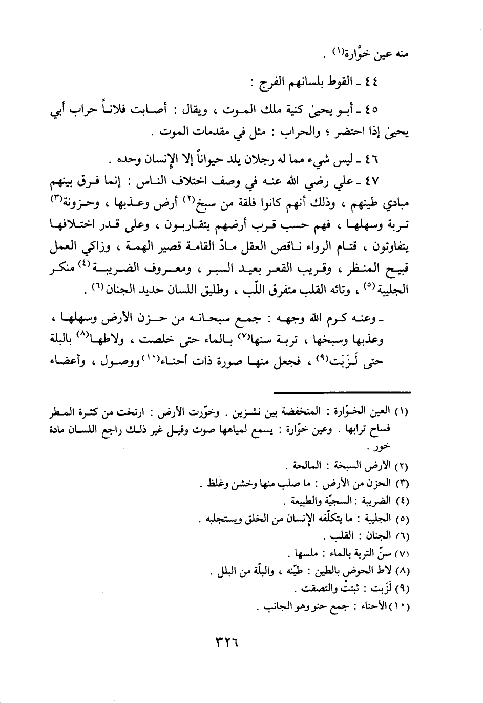 - وعنه كرم الله وجهه: جمع سبحانه من حزن الأرض وسهلها، وعذبها وسبخها، تربة سنها «7» بالماء حتى خلصت، ولاطها «8» بالبلة حتى لزبت «9» ، فجعل منها صورة ذات أحناء «10» ووصول، وأعضاء