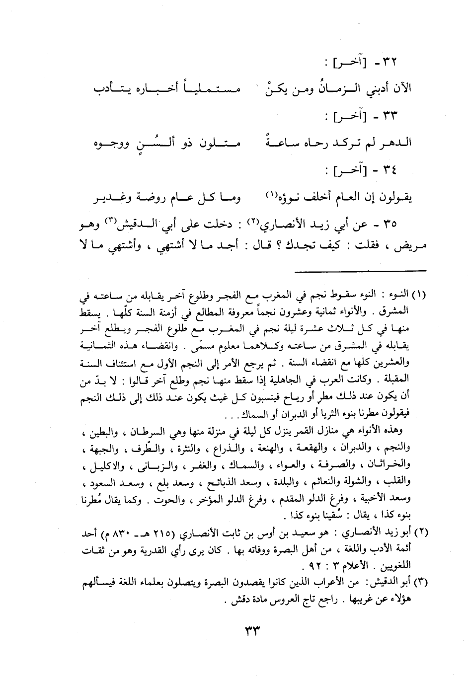 35- عن أبي زيد الأنصاري «2» : دخلت على أبي الدقيش «3» وهو مريض، فقلت: كيف تجدك؟ قال: أجد ما لا أشتهي، وأشتهي ما لا