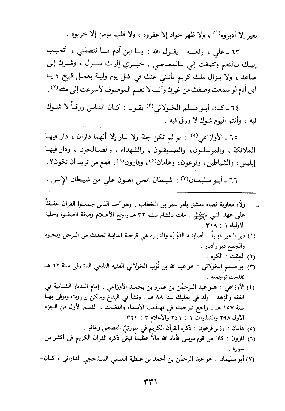 64- كان أبو مسلم الخولاني «3» يقول: كان الناس ورقا لا شوك فيه، وأنتم اليوم شوك لا ورق فيه.