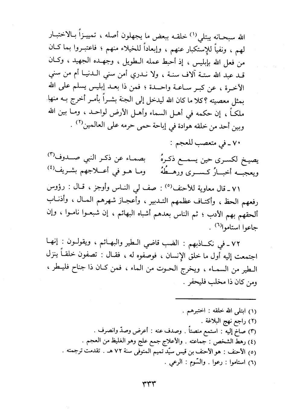 71- قال معاوية للأحنف «5» : صف لي الناس وأوجز، قال: رؤوس رفعهم الحظ، وأكتاف عظمهم التدبير، وأعجاز شهرهم المال، وأذناب ألحقهم بهم الأدب؛ ثم الناس بعدهم أشباه البهائم، إن شبعوا ناموا، وإن جاعوا استاموا «6» .