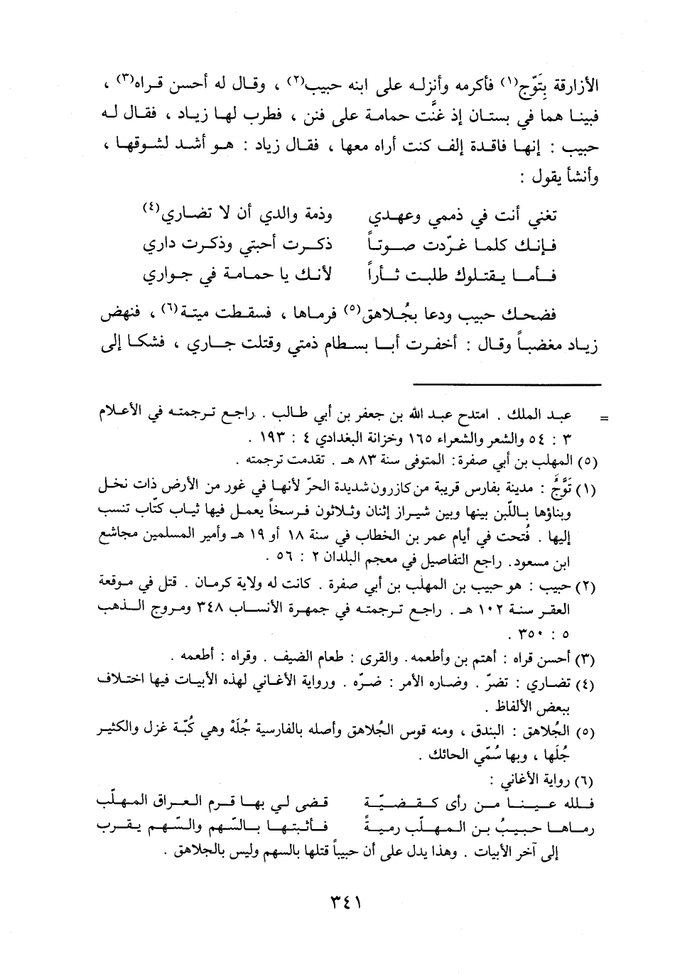 الأزارقة بتوّج «1» فأكرمه وأنزله على ابنه حبيب «2» ، وقال له أحسن قراه «3» ، فبينا هما في بستان إذ غنّت حمامة على فنن، فطرب لها زياد، فقال له حبيب: إنها فاقدة إلف كنت أراه معها، فقال زياد: هو أشد لشوقها، وأنشأ يقول: