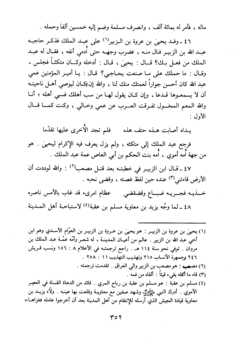 46- وفد يحيى بن عروة بن الزبير «1» على عبد الملك فذكر حاجبه عبد الله بن الزبير فنال منه، فضرب وجهه حتى أدمي أنفه، فقال له عبد الملك من فعل بك؟ قال: يحيى، قال: أدخله وكان متكئا فجلس، وقال: ما حملك على ما صنعت بحاجبي؟ قال: يا أمير المؤمنين عمي عبد الله كان أحسن جوارا لعمتك منك لنا، والله إن كان ليوصي أهل ناحيته أن لا يسمعوها قدعا، وإن كان يقول لها من سب أهلك فسبي أهله؛ أنا والله المعم المخول تفرقت العرب عن عمي وخالي، وكنت كما قال الأول: