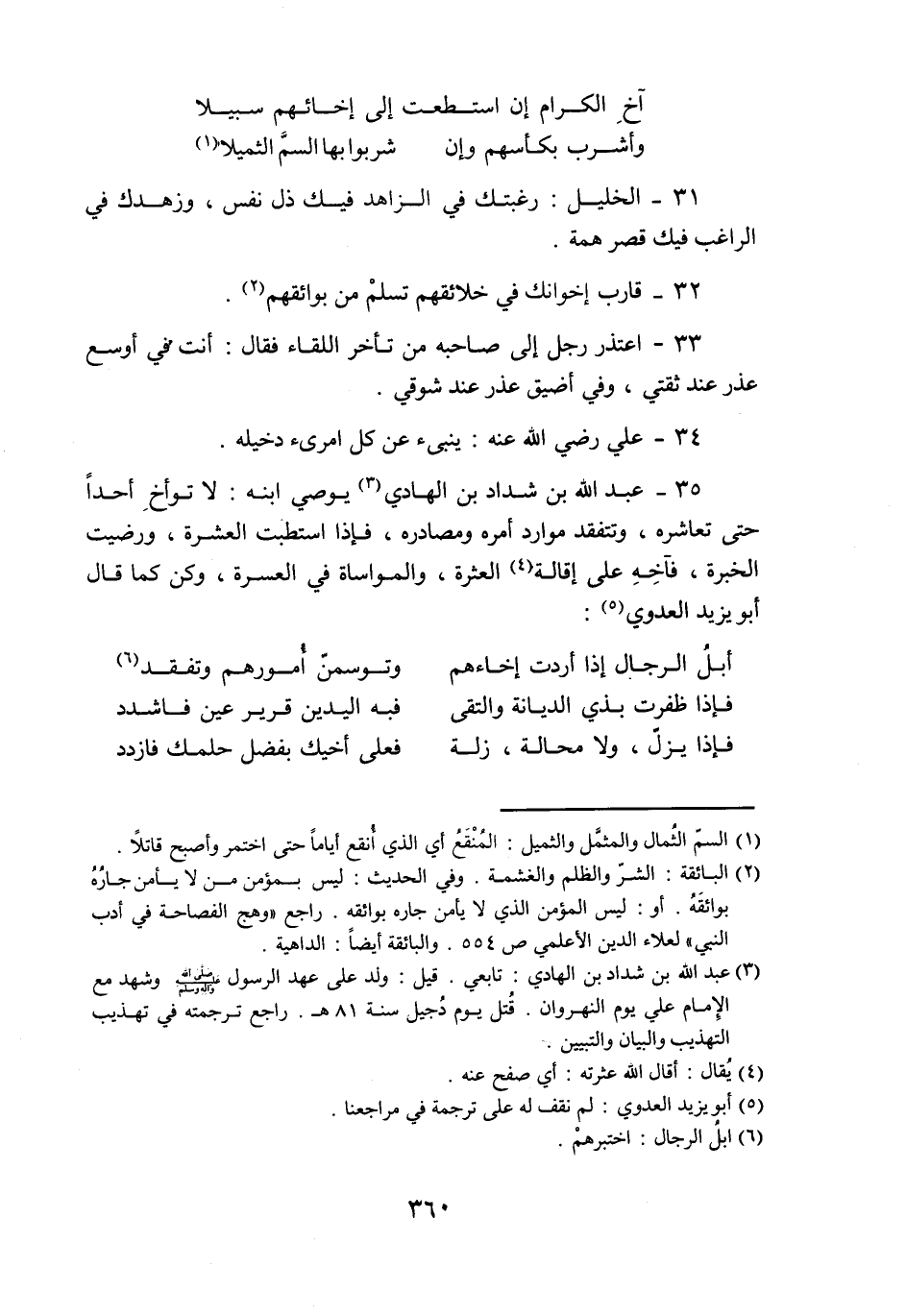35- عبد الله بن شداد بن الهادي «3» يوصي ابنه: لا توأخ أحدا حتى تعاشره، وتتفقد موارد أمره ومصادره، فإذا استطبت العشرة، ورضيت الخبرة، فآخه على إقالة «4» العثرة، والمواساة في العسرة، وكن كما قال أبو يزيد العدوي «5» :
