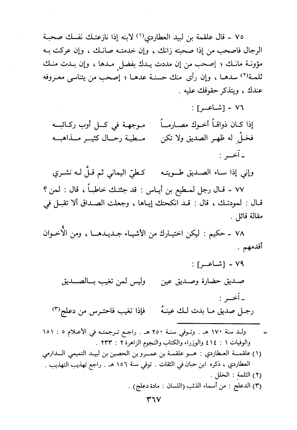 75- قال علقمة بن لبيد العطاردي «1» لابنه إذا نازعتك نفسك صحبة الرجال فاصحب من إذا صحبته زانك، وإن خدمته صانك، وإن عركت به مؤونة مانك؛ إصحب من إن مددت يدك بفضل مدها، وإن بدت منك ثلمة «2» سدها، وإن رأى منك حسنة عدها؛ إصحب من يتناسى معروفه عندك، ويتذكر حقوقك عليه.
