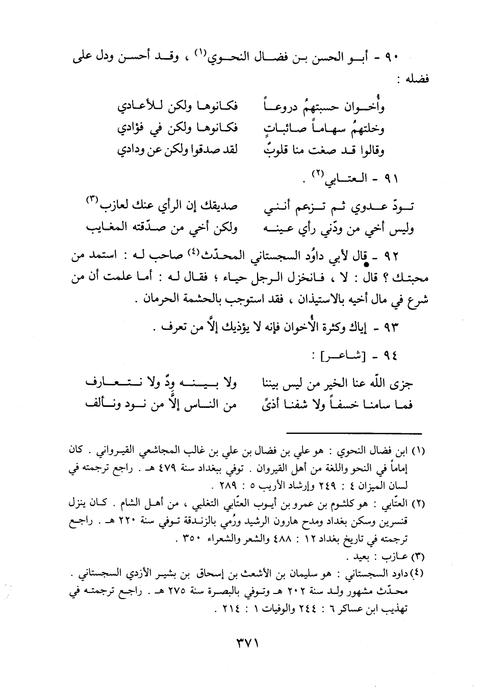 92- قال لأبي داود السجستاني المحدّث «4» صاحب له: استمد من محبتك؟ قال: لا، فانخزل الرجل حياء؛ فقال له: أما علمت أن من شرع في مال أخيه بالاستيذان، فقد استوجب بالحشمة الحرمان.