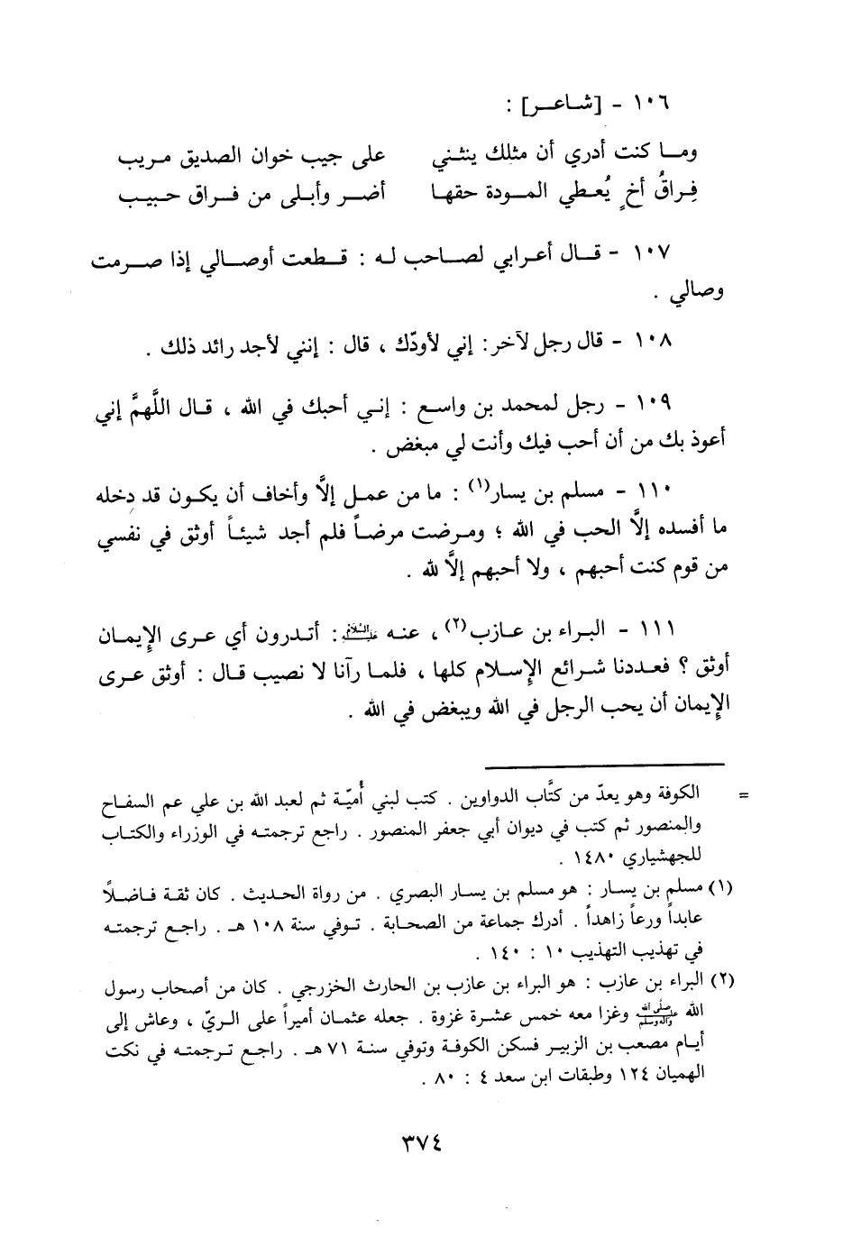 111- البراء بن عازب «2» ، عنه عليه السّلام: أتدرون أي عرى الإيمان أوثق؟ فعددنا شرائع الإسلام كلها، فلما رآنا لا نصيب قال: أوثق عرى الإيمان أن يحب الرجل في الله ويبغض في الله.