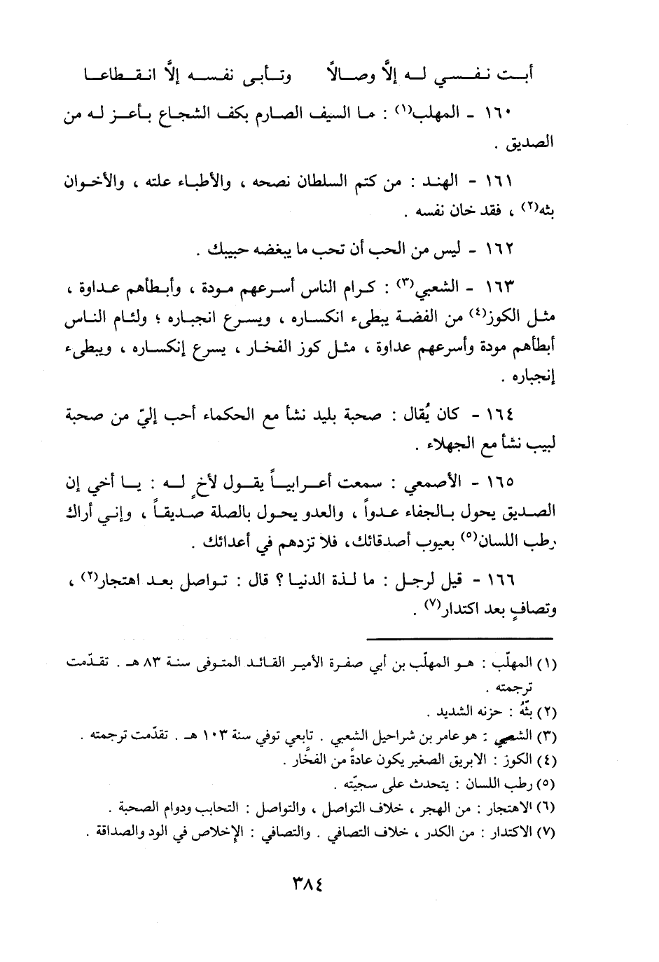 165- الأصمعي: سمعت أعرابيا يقول لأخ له: يا أخي إن الصديق يحول بالجفاء عدوا، والعدو يحول بالصلة صديقا، وإني أراك رطب اللسان «5» بعيوب أصدقائك، فلا تزدهم في أعدائك.