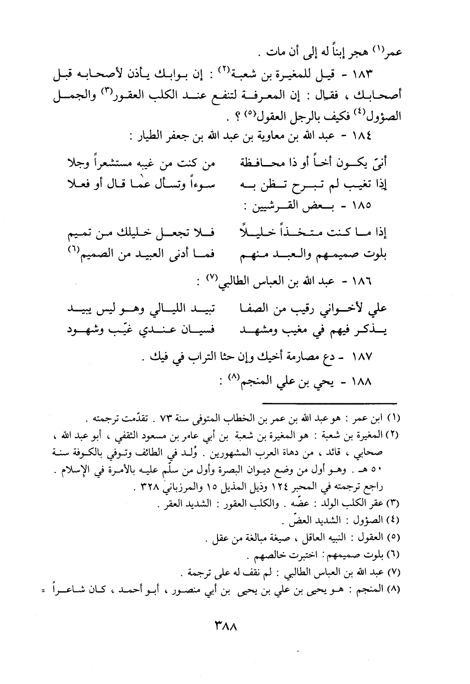 183- قيل للمغيرة بن شعبة «2» : إن بوابك يأذن لأصحابه قبل أصحابك، فقال: إن المعرفة لتنفع عند الكلب العقور «3» والجمل الصؤول «4» فكيف بالرجل العقول «5» ؟.