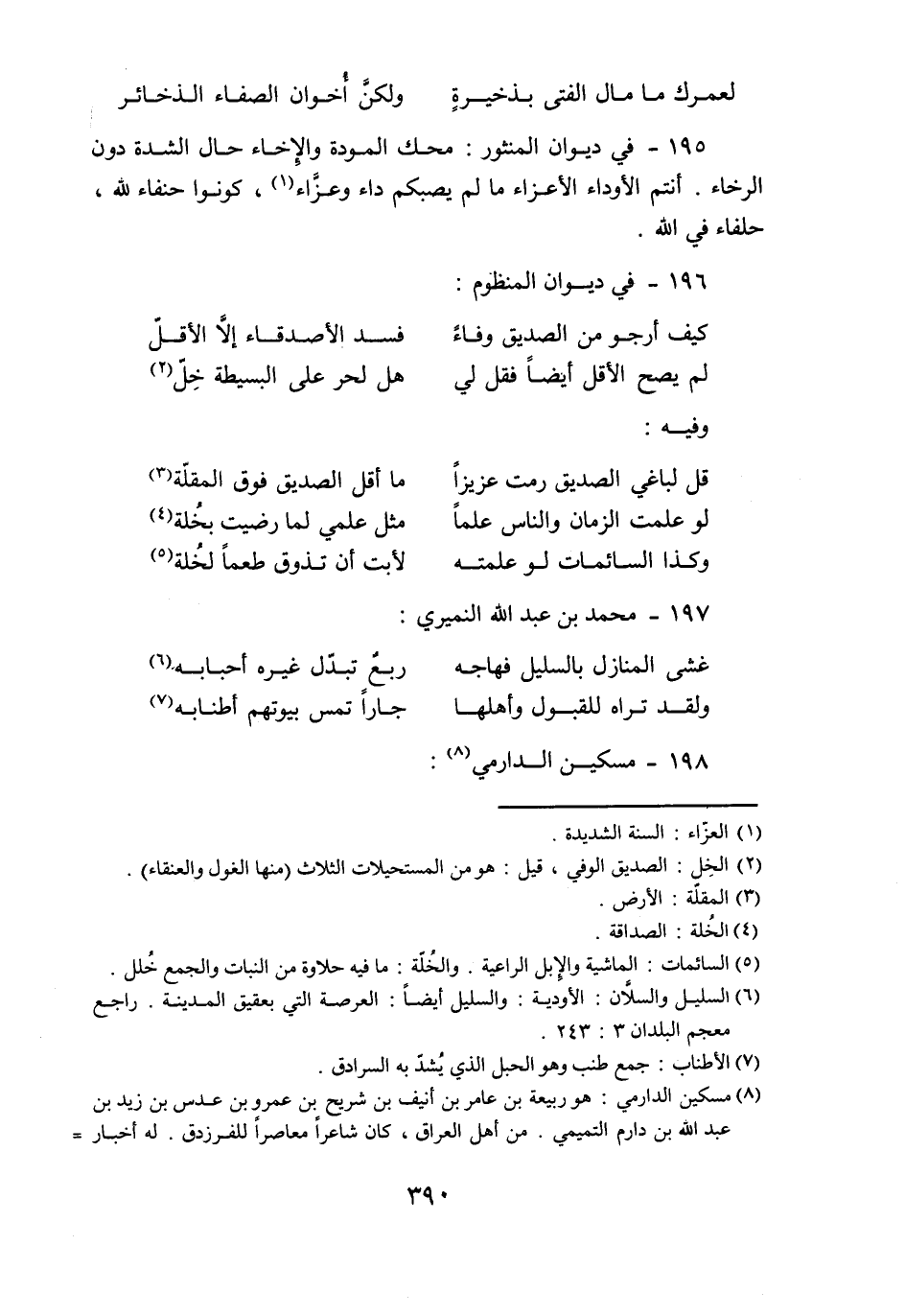 195- في ديوان المنثور: محك المودة والإخاء حال الشدة دون الرخاء. أنتم الأوداء الأعزاء ما لم يصبكم داء وعزّاء «1» ، كونوا حنفاء لله، حلفاء في الله.