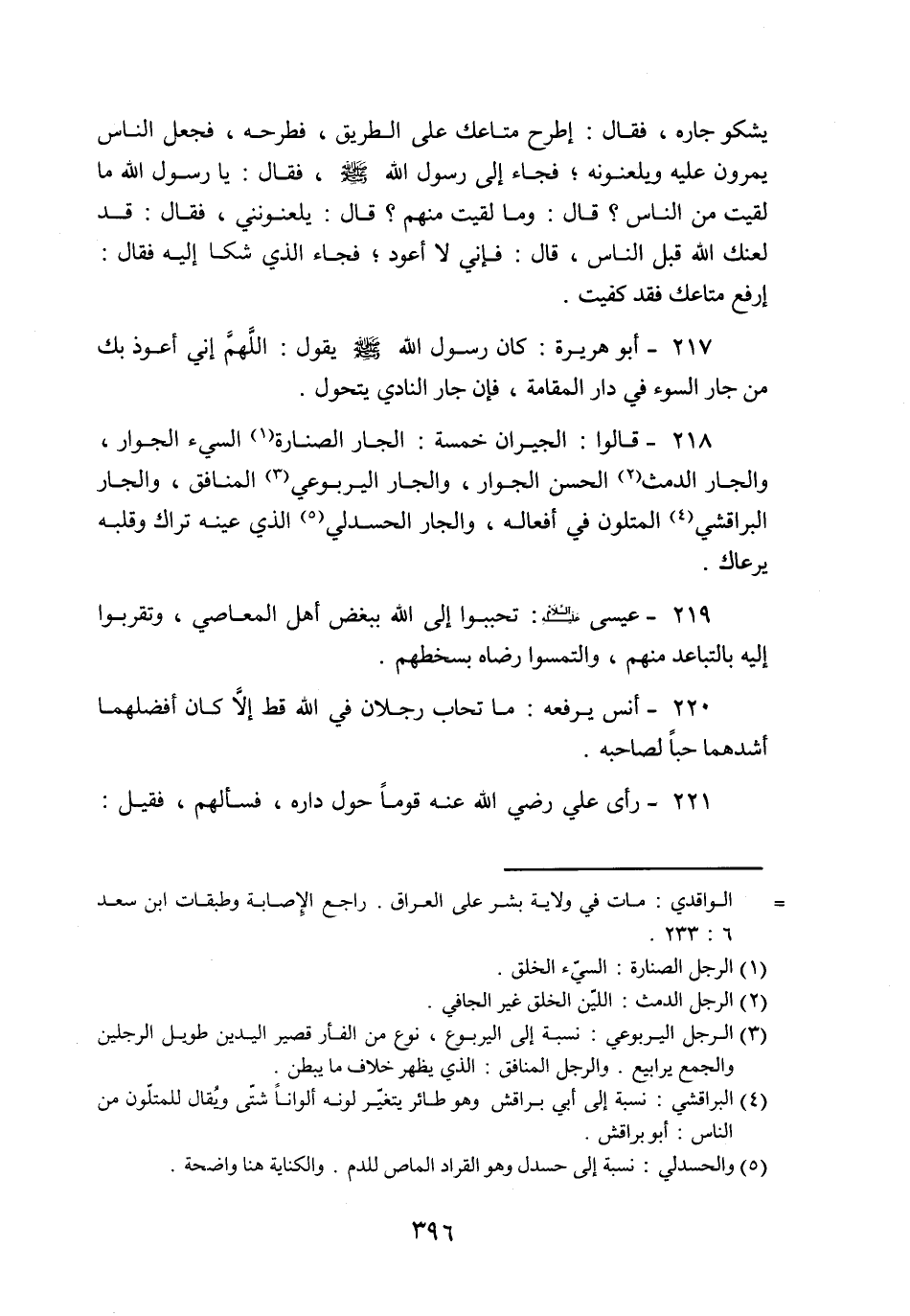 218- قالوا: الجيران خمسة: الجار الصنارة «1» السيء الجوار، والجار الدمث «2» الحسن الجوار، والجار اليربوعي «3» المنافق، والجار البراقشي «4» المتلون في أفعاله، والجار الحسدلي «5» الذي عينه تراك وقلبه يرعاك.