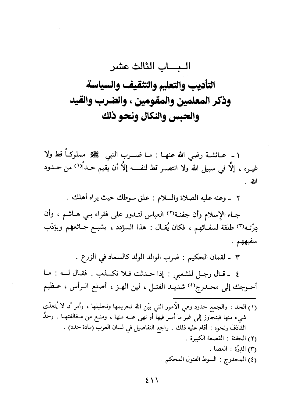 الباب الثالث عشر التأديب والتعليم والتثقيف والسياسة وذكر المعلمين والمقومين، والضرب والقيد والحبس والنكال ونحو ذلك