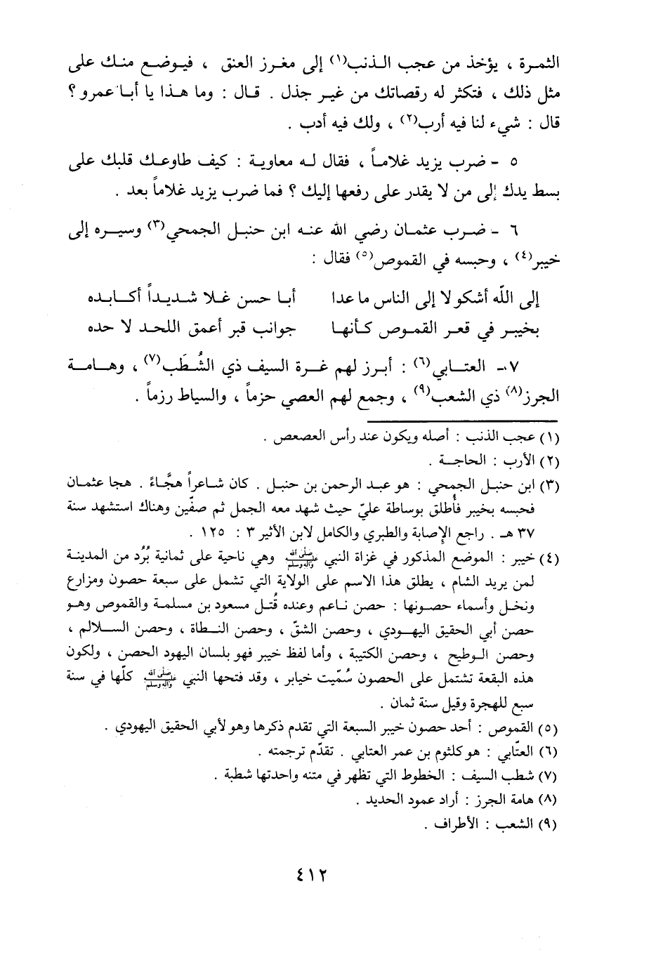 6- ضرب عثمان رضي الله عنه ابن حنبل الجمحي «3» وسيره إلى خيبر «4» ، وحبسه في القموص «5» فقال: