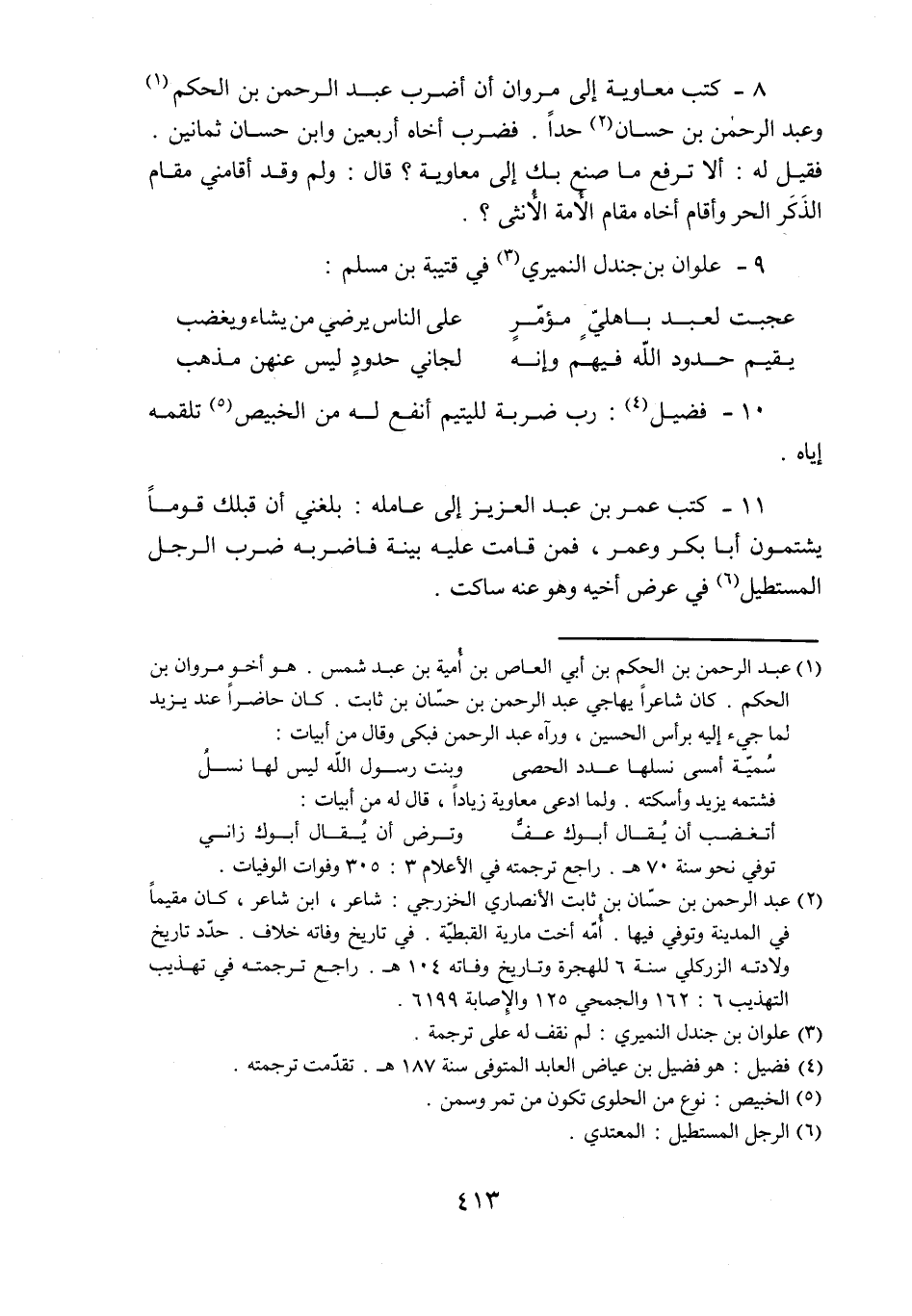 8- كتب معاوية إلى مروان أن أضرب عبد الرحمن بن الحكم «1» وعبد الرحمن بن حسان «2» حدا. فضرب أخاه أربعين وابن حسان ثمانين.