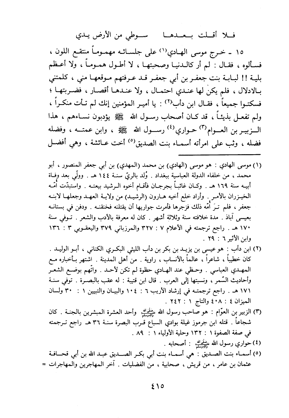 15- خرج موسى الهادي «1» على جلسائه مهموما منتقع اللون، فسألوه، فقال: لم أر كالدنيا وصحبتها، لا أطول هموما، ولا أعظم بلية!! لبابة بنت جعفر بن أبي جعفر قد عرفتهم موقعها مني، كلمتني بالادلال، فلم يكن لها عندي احتمال، ولا عندها أقصار، فضربتها؛ فسكتوا جميعا، فقال ابن دأب «2» : يا أمير المؤمنين إنك لم تأت منكرا، ولم تفعل بذيئا، قد كان أصحاب رسول الله صلّى الله عليه وسلّم يؤدبون نساءهم، هذا الزبير بن العوام «3» حواري «4» رسول الله صلّى الله عليه وسلّم، وابن عمته، وفضله فضله، وثب على امرأته أسماء بنت الصديق «5» أخت عائشة، وهي أفضل