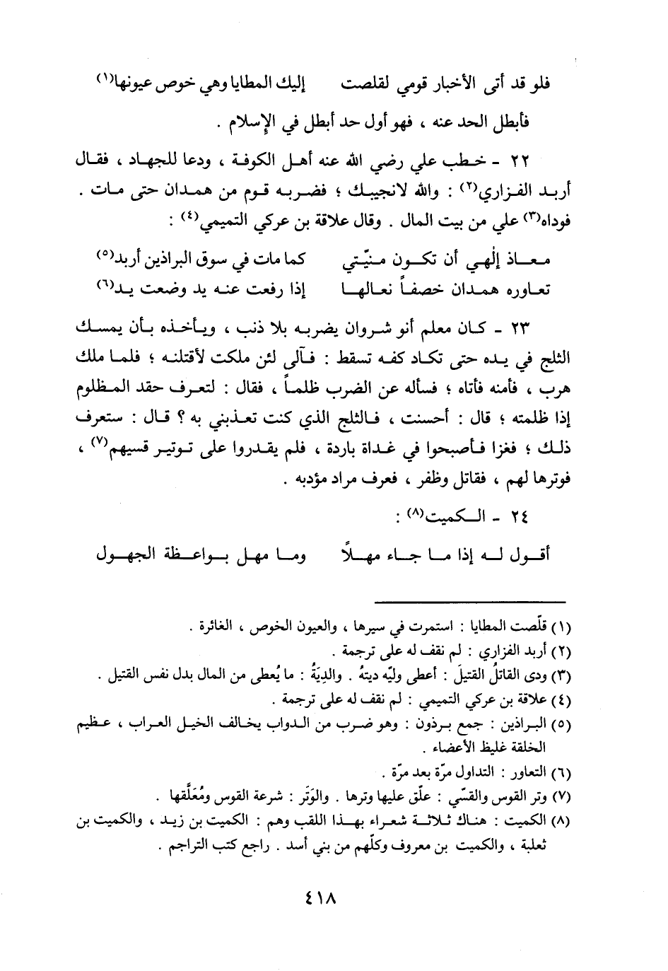 22- خطب علي رضي الله عنه أهل الكوفة، ودعا للجهاد، فقال أربد الفزاري «2» : والله لانجيبك؛ فضربه قوم من همدان حتى مات.