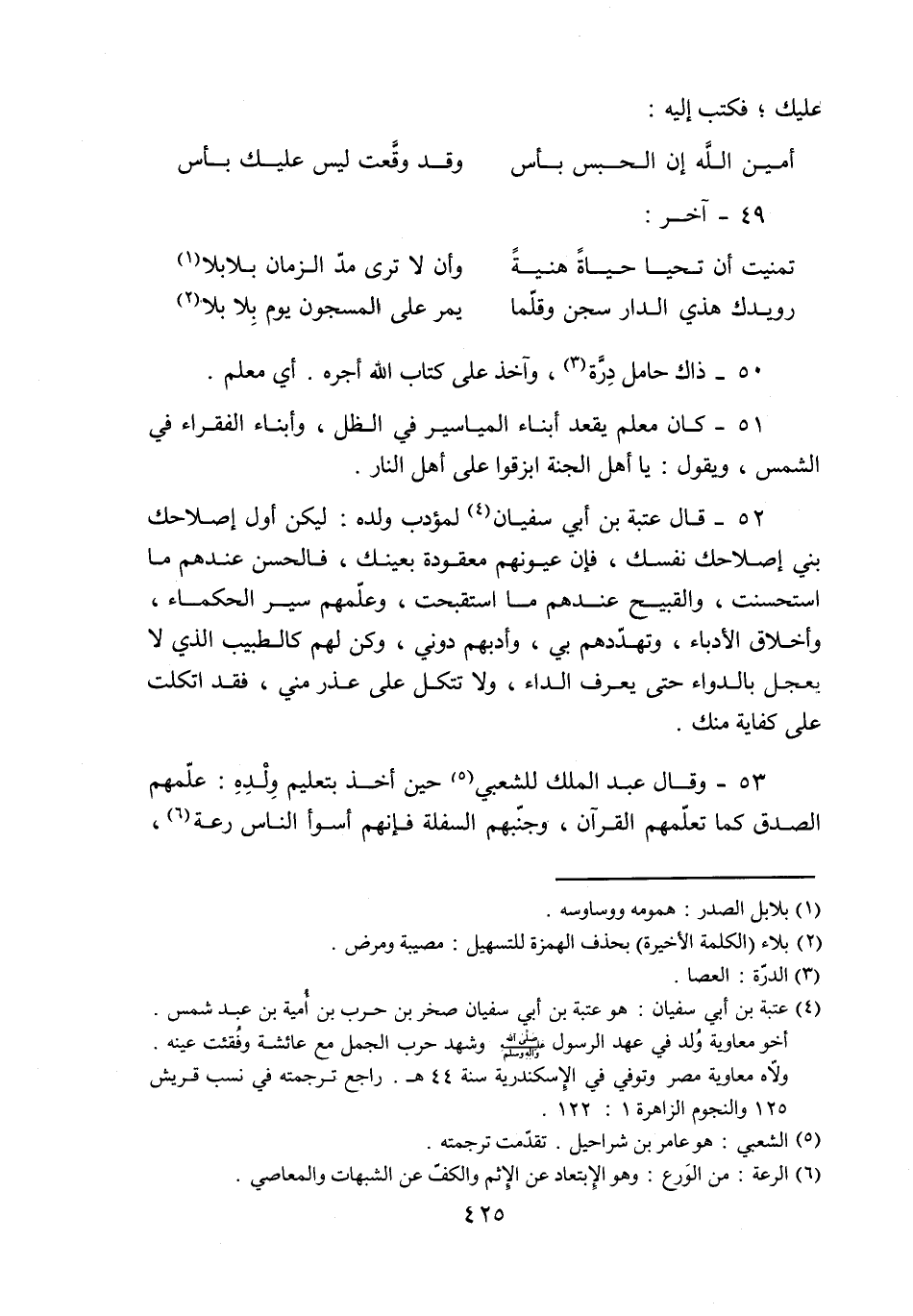 52- قال عتبة بن أبي سفيان «4» لمؤدب ولده: ليكن أول إصلاحك بني إصلاحك نفسك، فإن عيونهم معقودة بعينك، فالحسن عندهم ما استحسنت، والقبيح عندهم ما استقبحت، وعلّمهم سير الحكماء، وأخلاق الأدباء، وتهدّدهم بي، وأدبهم دوني، وكن لهم كالطبيب الذي لا بعجل بالدواء حتى يعرف الداء، ولا تتكل على عذر مني، فقد اتكلت على كفاية منك.