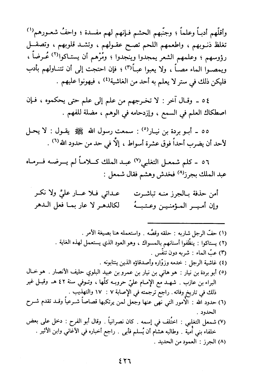 55- أبو بردة بن نيار «5» : سمعت رسول الله صلّى الله عليه وسلّم يقول: لا يحل لأحد أن يضرب أحدا فوق عشرة أسواط، إلّا في حد من حدود الله «6» .