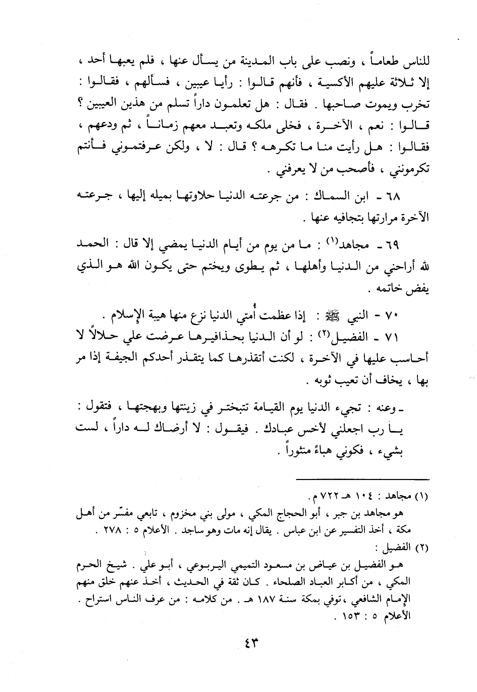 71- الفضيل «2» : لو أن الدنيا بحذافيرها عرضت علي حلالا لا أحاسب عليها في الآخرة، لكنت أتقذرها كما يتقذر أحدكم الجيفة إذا مر بها، يخاف أن تعيب ثوبه.