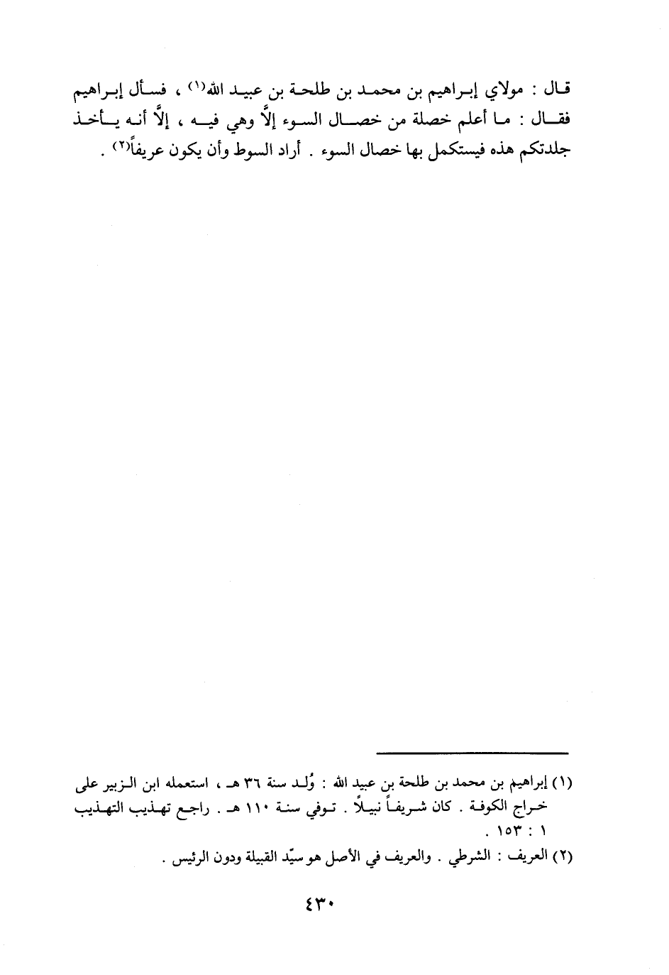 قال: مولاي إبراهيم بن محمد بن طلحة بن عبيد الله «1» ، فسأل إبراهيم فقال: ما أعلم خصلة من خصال السوء إلّا وهي فيه، إلّا أنه يأخذ جلدتكم هذه فيستكمل بها خصال السوء. أراد السوط وأن يكون عريفا «2» .