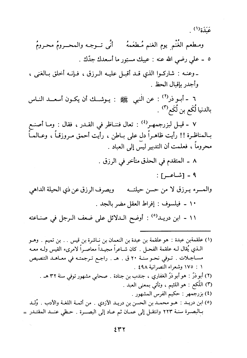 7- قيل لبزرجمهر «4» : تعال فنناظر في القدر، فقال: وما أصنع بالمناظرة!! رأيت ظاهرا دل على باطن، رأيت أحمق مروزقا، وعالما محروما، فعلمت أن التدبير ليس إلى العباد.