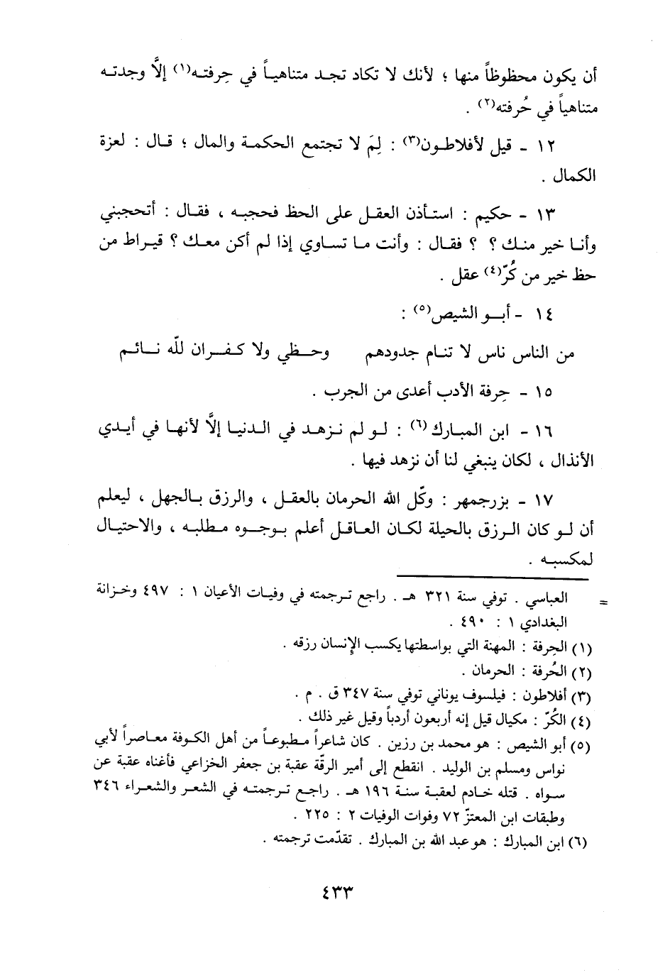 13- حكيم: استأذن العقل على الحظ فحجبه، فقال: أتحجبني وأنا خير منك؟؟ فقال: وأنت ما تساوي إذا لم أكن معك؟ قيراط من حظ خير من كرّ «4» عقل.