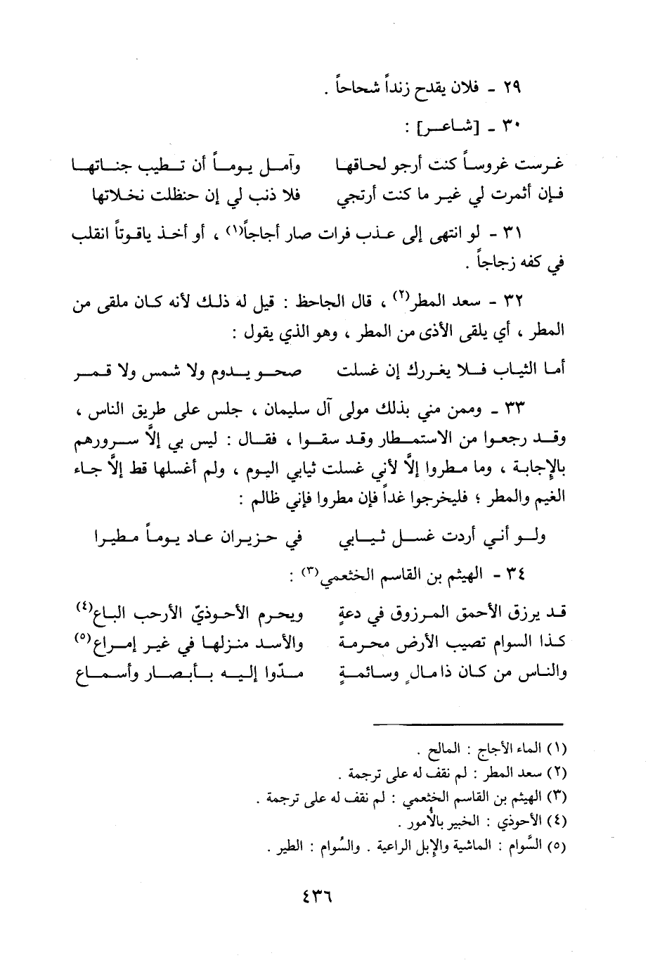 32- سعد المطر «2» ، قال الجاحظ: قيل له ذلك لأنه كان ملقى من المطر، أي يلقى الأذى من المطر، وهو الذي يقول: