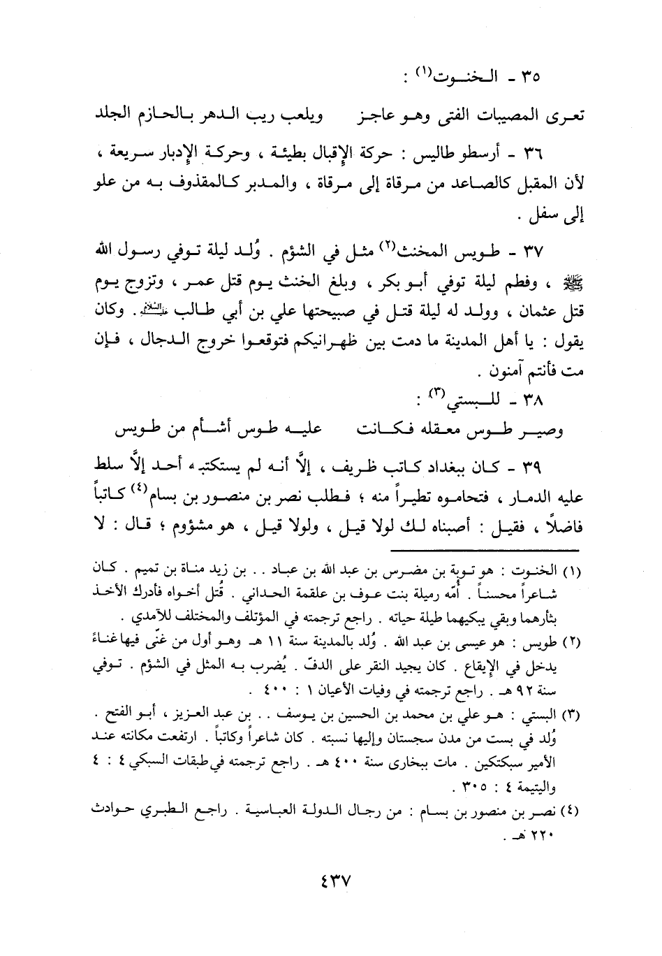 37- طويس المخنث «2» مثل في الشؤم. ولد ليلة توفي رسول الله صلّى الله عليه وسلّم، وفطم ليلة توفي أبو بكر، وبلغ الخنث يوم قتل عمر، وتزوج يوم قتل عثمان، وولد له ليلة قتل في صبيحتها علي بن أبي طالب عليه السّلام. وكان يقول: يا أهل المدينة ما دمت بين ظهرانيكم فتوقعوا خروج الدجال، فإن مت فأنتم آمنون.
