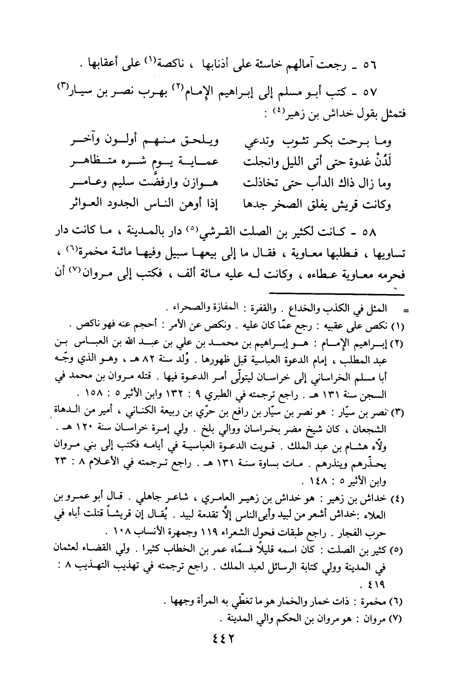 57- كتب أبو مسلم إلى إبراهيم الإمام «2» بهرب نصر بن سيار «3» فتمثل بقول خداش بن زهير «4» :