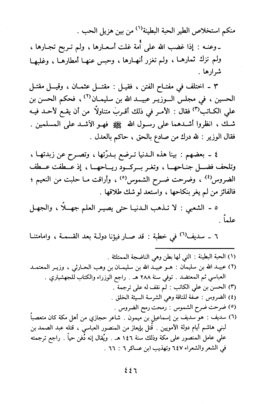 3- اختلف في مفتاح الفتن، فقيل: مقتل عثمان، وقيل مقتل الحسين، في مجلس الوزير عبيد الله بن سليمان «2» ، فحكم الحسن بن علي الكاتب «3» فقال: الأمر في ذلك أقرب متناولا من أن يقع لأحد فيه شك، انظروا أشدهما على رسول الله صلّى الله عليه وسلّم فهو الأشد على المسلمين.