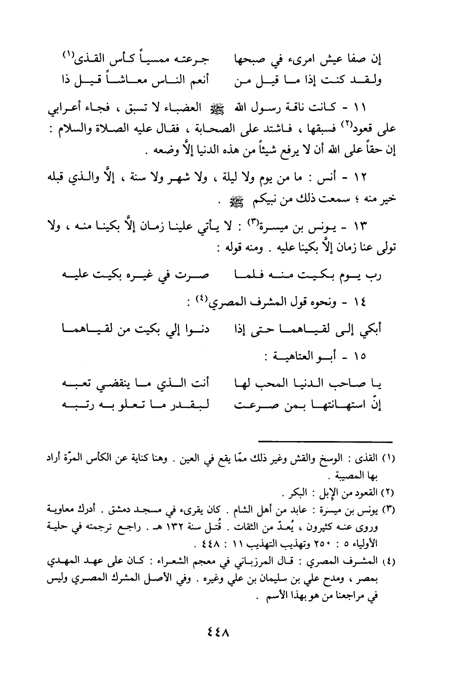 13- يونس بن ميسرة «3» : لا يأتي علينا زمان إلّا بكينا منه، ولا تولى عنا زمان إلّا بكينا عليه. ومنه قوله: