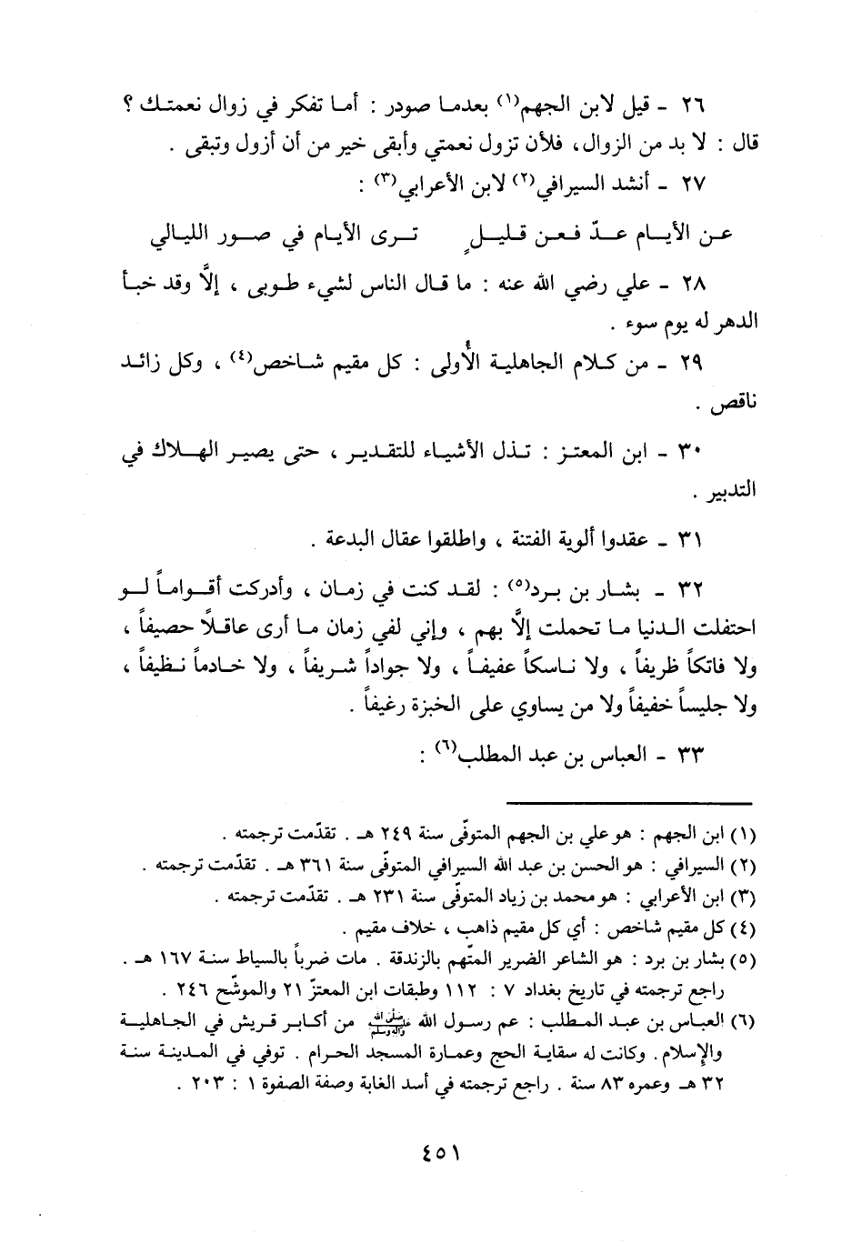32- بشار بن برد «5» : لقد كنت في زمان، وأدركت أقواما لو احتفلت الدنيا ما تحملت إلّا بهم، وإني لفي زمان ما أرى عاقلا حصيفا، ولا فاتكا ظريفا، ولا ناسكا عفيفا، ولا جوادا شريفا، ولا خادما نظيفا، ولا جليسا خفيفا ولا من يساوي على الخبزة رغيفا.