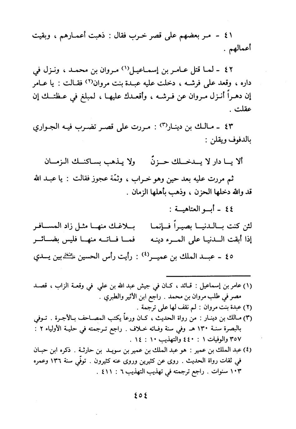 42- لما قتل عامر بن إسماعيل «1» مروان بن محمد، ونزل في داره، وقعد على فرشه، دخلت عليه عبدة بنت مروان «2» فقالت: يا عامر إن دهرا أنزل مروان عن فرشه، وأقعدك عليها، لمبلغ في عظتك إن عقلت.