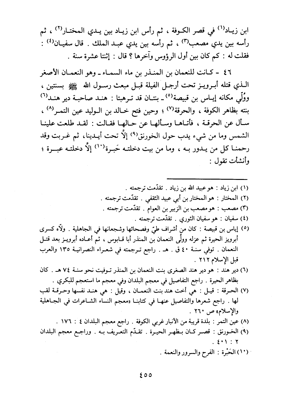 46- كانت للنعمان بن المنذر بن ماء السماء- وهو النعمان الأصغر الذي قتله أبرويز تحت أرجل الفيلة قبل مبعث رسول الله صلّى الله عليه وسلّم بسنتين، وولّي مكانه إياس بن قبيصة «5» - بنتان قد ترهبتا: هند صاحبة دير هند «6» بنته بظاهر الكوفة، والحرقة «7» ؛ وحين فتح خالد بن الوليد عين التمر «8» ، سأل عن الحرقة، فأتاها وسألها عن حالها فقالت: لقد طلعت علينا الشمس وما من شيء يدب حول الخورنق «9» إلّا تحت أيدينا، ثم غربت وقد رحمنا كل من يدور به، وما من بيت دخلته حبرة «10» إلّا دخلته عبرة؛ وأنشأت تقول: