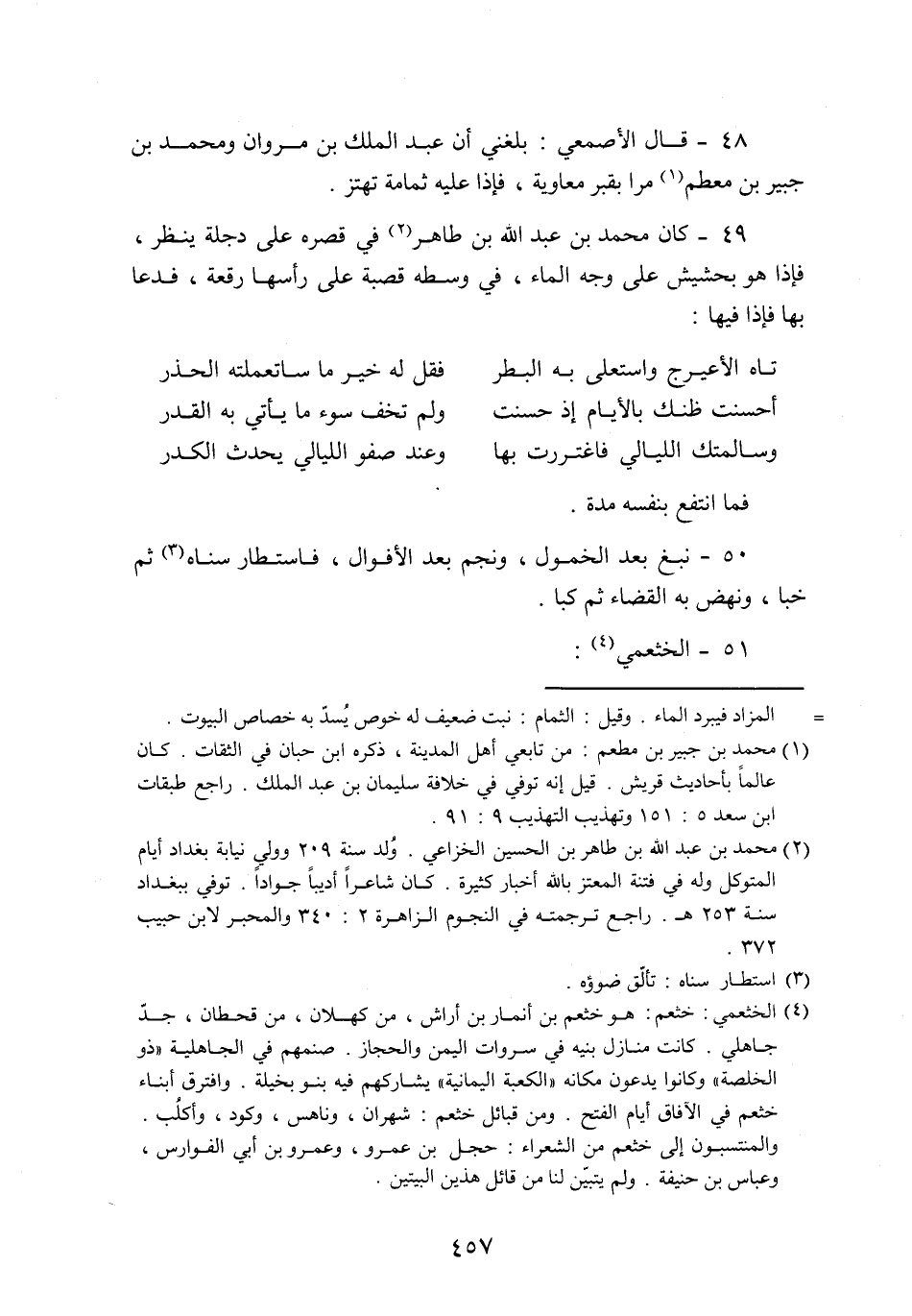 49- كان محمد بن عبد الله بن طاهر «2» في قصره على دجلة ينظر، فإذا هو بحشيش على وجه الماء، في وسطه قصبة على رأسها رقعة، فدعا بها فإذا فيها: