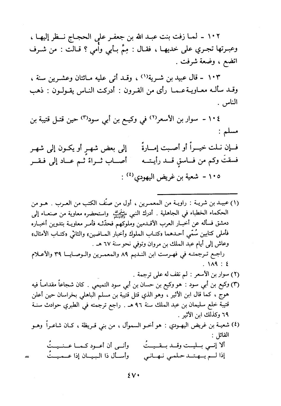 103- قال عبيد بن شرية «1» ، وقد أتى عليه مائتان وعشرين سنة، وقد سأله معاوية عما رأى من القرون: أدركت الناس يقولون: ذهب الناس.