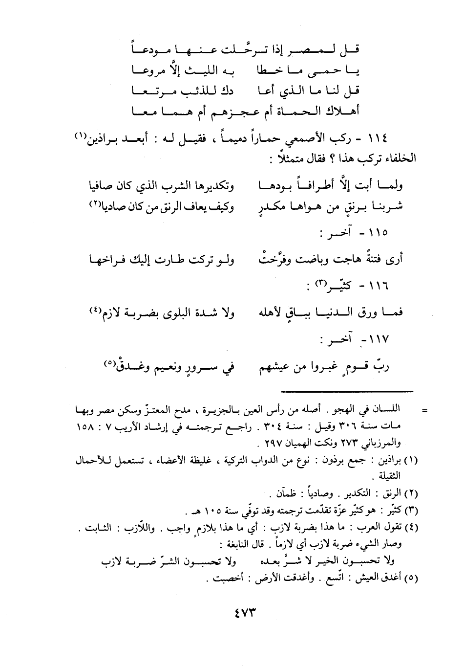 أهلاك الحماة أم عجزهم أم هما معا 114- ركب الأصمعي حمارا دميما، فقيل له: أبعد براذين «1» الخلفاء تركب هذا؟ فقال متمثلا: